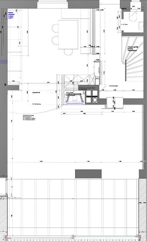 Die ursprüngliche Grundrissstruktur der Erdgeschossebene mit Küche, Essen und Wohnen wurde zu Gunsten eines fließenden großzügigen Raumempfindens radikal aufgebrochen.
