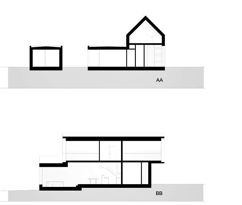 Das mit Satteldach entworfene Wohnhaus versucht die Aufgabe auf die wesentlichen geometrischen Grundformen eines Eckgebäudes zu reduzieren. Die Fensteröffnungen folgen selbstverständlich der geometrischen und statischen Logik der Kubatur. Große raumhohe Öffnungen werden nur an solchen Stellen platziert, welche die Geometrie der Baukörper verstärken, aber trotzdem die inneren Funktionen natürlich unterstützen. Ein Winkelgrundriss mit angrenzendem Nebengelass bildet einen kleinen Hof und folgt damit der typisch regionalen Typologie des Hofhauses.